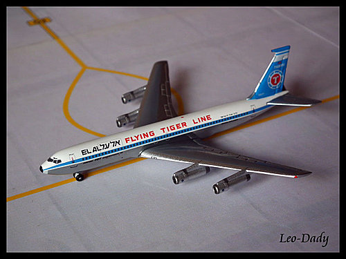 這款模型是Net Model的1/500產品,於2005年上市發行。會收這架飛機當然是衝著飛虎航空而來,想當年在松山”國際”機場的年代,飛虎航空和西北航空一樣都是主要角色呢! 這架B707的塗裝還是飛虎較早期的水藍色塗裝,垂直尾翼的色調和圖案,看起來跟ANA的Mohican舊塗裝有幾分像;機身上除了原本Flying Tiger的標題外,還有以色列航空EL AL的title;另外此模型的機腹採用亮面處理。飛虎航空同機型編號(N317F)的模型在NM之前,其實AC搶先於2004年已出過1/400的產品,moto兄也曾發表過,請<參考>。
