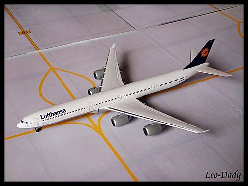 再來是德航的A340-600標準塗裝,相信不少人都喜歡A346修長的機身,可惜我還沒有國泰或泰航的A346。這款模型也是Herpa於2006年發行的1/500產品,產品型號HE507417;或許同樣是德國公司,Herpa出了滿坑滿谷的德航模型,而且以1/500比例為主,以A340-600而言,從2002年開始,D-AIHA、B、C (D-AIHC是星空聯盟彩繪機)、D、E、到去年的D-AIHF,Herpa幾乎每年就會推出一款更新版的A340-600模型,照這樣推算下去搞不好今年又會發行D-AIHH!! 這情形對本地航迷來說可能沒太大意義,但德國航迷應該會很歡迎吧。